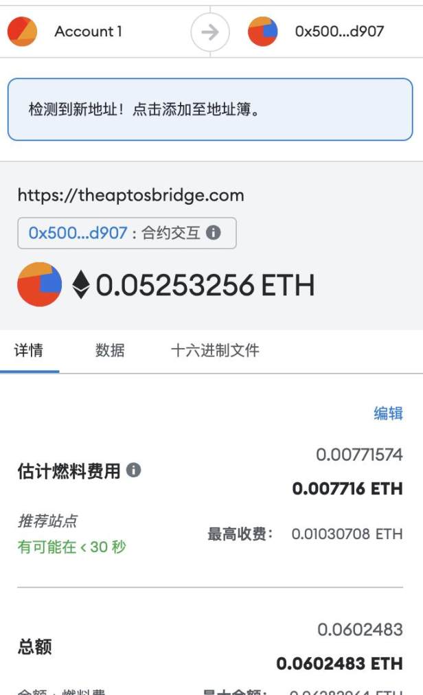 需要同时连接小狐狸 / Coinbase 钱包和 Aptos 钱包,然后输入要跨链的资产之后,会在发起转账地址确认交易,这一步骤除了会收取 Gas 费之外,还会扣除 LayerZero 跨链合约交互的手续费,费用相对较高。