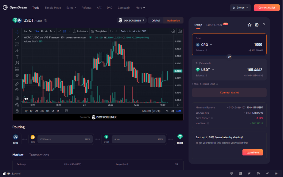 Apart from swaps, we also provide limit order functionality on Cronos for traders to get their set desired price for any supported tokens. Along with OpenOcean’ aggregation protocol, we implement both AMM & RFQ mechanisms in limit order function to help efficiently raise the fulfillment rate. OpenOcean is the only DEX aggregator with a full charting suite built for both swaps and limit order trades. Together with TradingView, we can cater to all kinds of users to execute their investment strategies and enjoy a CEX-like trading experience.