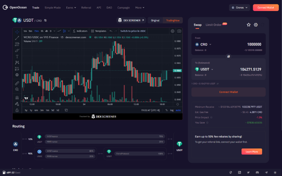 We have integrated most of the major liquidity sources on Cronos: VVS Finance, Ferro Protocol, MM Finance, Annex, CronaSwap, Crodex. With OpenOcean’s improved algorithm and deep liquidity sources, our platform gives better returns than other DEXs or DEX aggregators based on multiple parameters, including better prices, lower gas fees, lower slippage, and optimized routing.