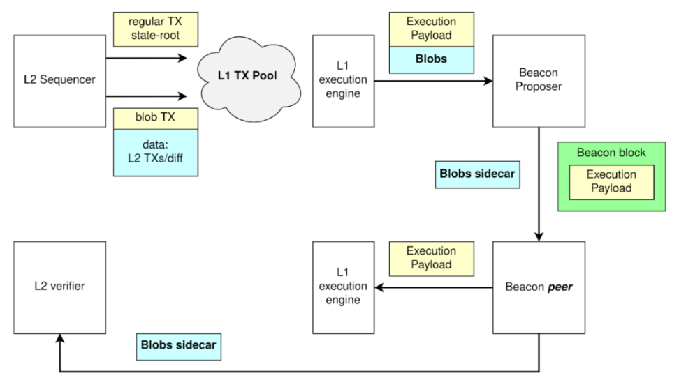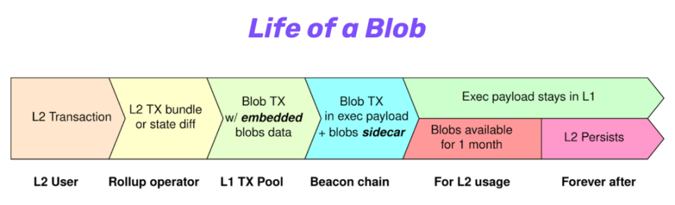 EIP-4844 引入一种新的交易类型,这种交易类型与普通以太坊交易相比多了一个 blob 的位置用来存放 L2 的数据。比较独特的是,Blob 数据在一个月之后就会被节点删除,从而很大地节省了存储空间。