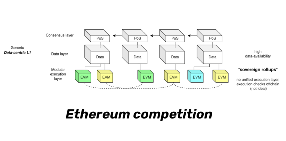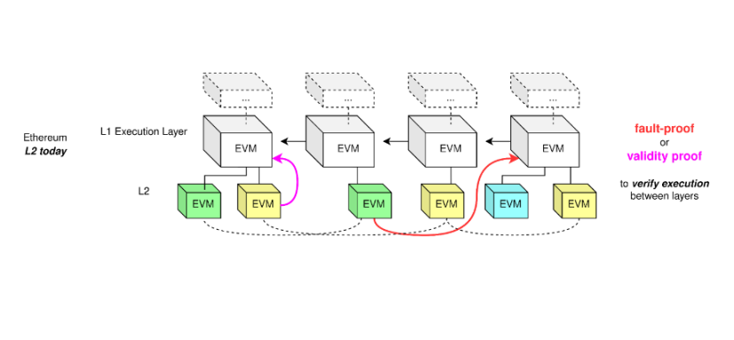 这是以太坊加上欺诈证明和有效性证明之后的示意图,相当于将 L2 作为一个执行层连接以太坊 EVM,然后你维持当前的 L2 执行层。但这也会有一个问题,因为就算可以堆叠执行层,但是这样效率不高,所以我们需要一个数据层。