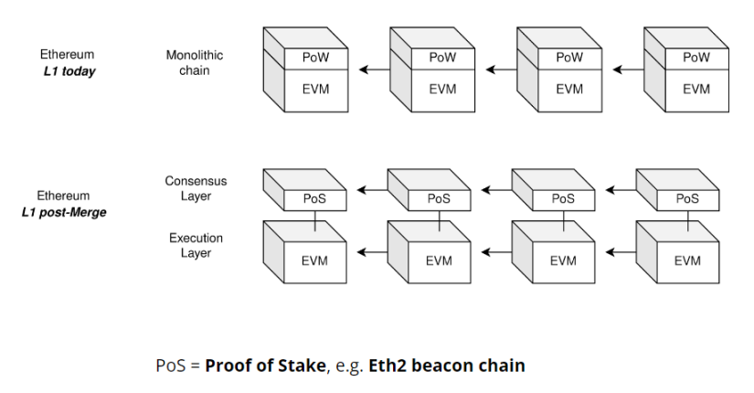 上面简单介绍了以 rollup 为中心的以太坊路线图中的区块链分层情况,那在 PoW 与 PoS、L1 与 L2 之间的模块化架构是怎样的呢?
