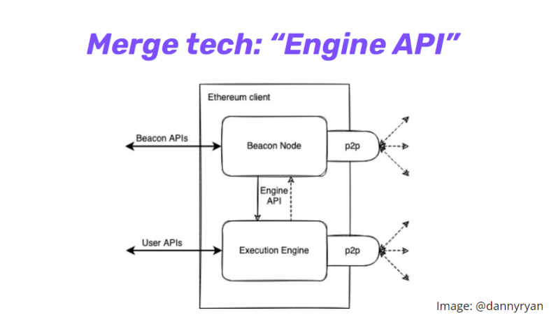 图中展示了合并前的单一型 PoW 链 vs. 合并后的 L1 共识层 (PoS) 和 L1 执行层 (EVM) 之间的模块化关系。而 PoS 和 EVM 之间的合并技术是通过一个叫做「Engine API」的东西实现的。下图是合并后完整客户端的样子,中间的 API 使得以太坊共识层 (PoS) 和执行层 (PoW) 之间可以实现通信。这是以太坊主网上的首个模块化设计。