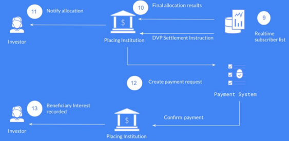 如果使用法币结算,配售机构在分布式账本上创建实时全额结算 RTGS 直接负债定向请求,发行方确认 RTGS 结算请求并触发发行方和配售银行之间的券款对付。如果使用稳定币或央行数字货币,则直接执行发行方和配售银行之间的券款对付。