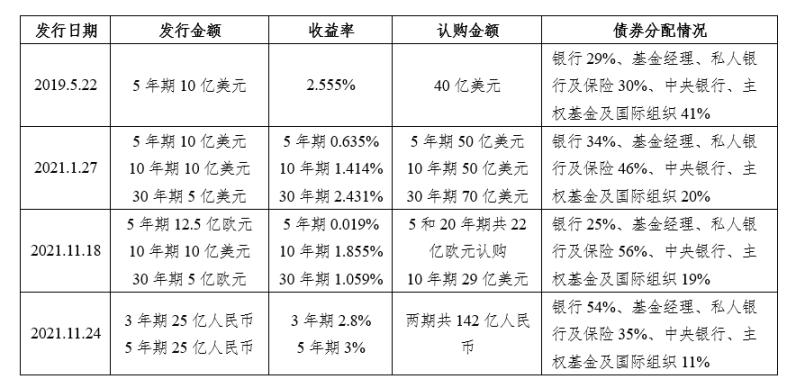 以政府绿色债券为例,香港政府绿色债券计划是政府为推动香港绿色金融尤其是绿色债券市场发展的一项措施。计划将所募集的资金用于政府绿色项目,同时通过该计划为市场上的绿色债券产品提供基准,香港金融管理局负责协助政府推行债券发行工作。2019 年 5 月 22 日发售了首批政府绿色债券,共计 10 亿美元,年期为 5 年,收益率为 2.555%。所募集的资金被拨入基本工程储备基金,为环境效益和香港可持续发展的公务工程提供资金。首批绿色债券吸引了 100 个国际机构投资者的认购,金额超过 40 亿美元,是发行金额的 4 倍,使最终定价较初定价格收窄 17.5 个基点[1]。之后分别于 2021 年 1 月 27 日,11 月 18 日和 24 日三次发行特区政府绿色债券,详细信息如表 1 所示。