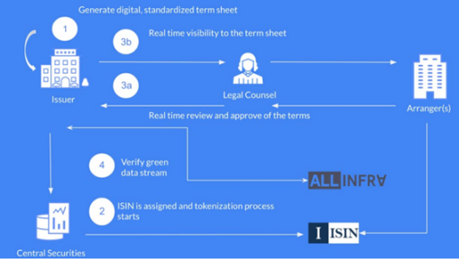 使用智能合约从如图 3 的 4 方面提升绿色债券发行准备阶段的效率:首先是在智能合约层创建标准的、可重复使用的债券投资条款清单,简化发行方准备工作;其次并为不同债券和代币资产提供灵活且定制化的 Tokenization 资产模型;还有通过分布式账本实现信息在发行方、配售机构、法律机构之间信息流的同步;最后是数据提供商 AllInfra 为绿色债券融资项目提供可信数据管理,打通资金供给和需求端,让收益计算有据可依。
