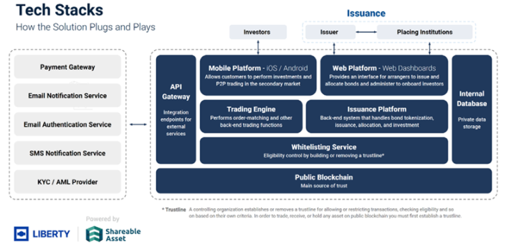 为追求数据的透明度和数据来源的开放性,Liberty 原型使用公有链 Stellar 作为底层。使用 Shareable Asset 的中间件构建平台核心功能支撑商业逻辑实现。上层界面包括了网页应用和移动应用两个,网页应用是用于发行发和配售机构对资产管理和行政事务处理;而移动应用是零售投资人用于交易、查询和资产持有的平台。