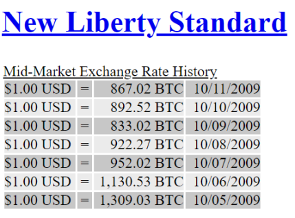 直到 2009 年 10 月 5 日,第一家比特币交易所诞生。New Liberty Standard 发布了第一个比特币 / 美元汇率,1.00 美元 = 1,309.03 比特币,每枚比特币的价格是 0.00764 美元。