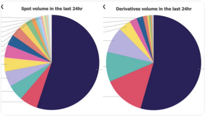 目前,币安体量最大。据 The Block 研究 VP Larry Cermak 在 10 月 24 日发表的统计数据显示,在过去 24 小时内,币安现货和衍生品的总和超过所有其他交易所,其中现货占总交易量的 55.1%,衍生品占总交易量的 54.4%。