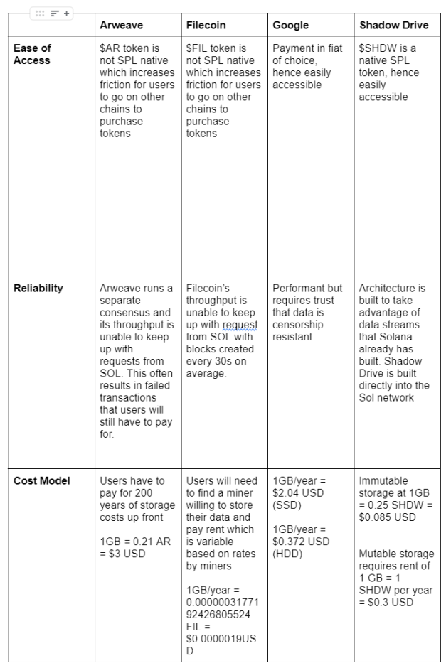 While Arweave and Filecoin are the most common third party storage solutions used, they are not compatible with Solana; the cost of storage for both is payable in their respective tokens and not SPL native, and the throughputs of both chains are unable to keep up with Solana which results in multiple failed transactions. The combination of these factors make it cumbersome for developers to integrate them on chain.