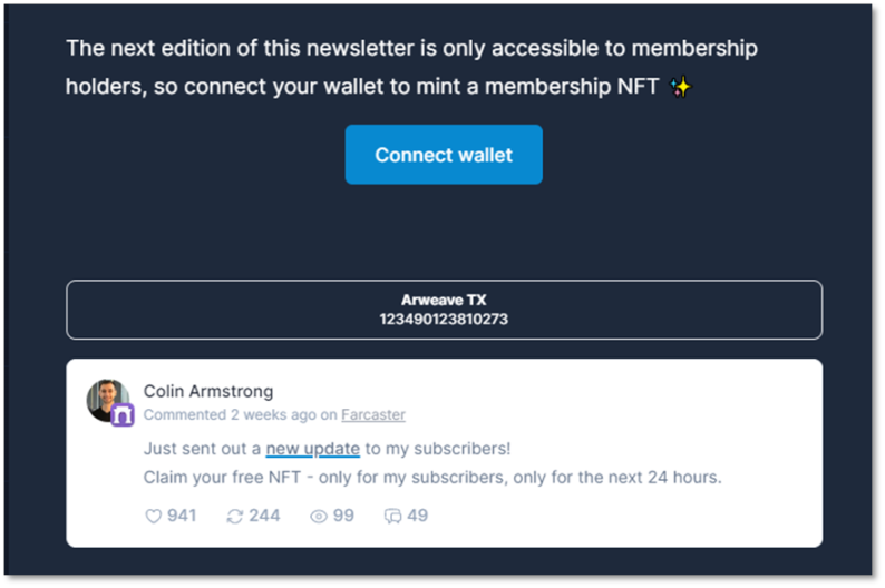 在货币化方面,创作者可以发行权益 NFT 或者加密 Token,赋予粉丝权利,比如获得 NFT 或者持有 Token 的粉丝可以订阅内容,定期收到更新推送,用 Token 支付订阅费等。