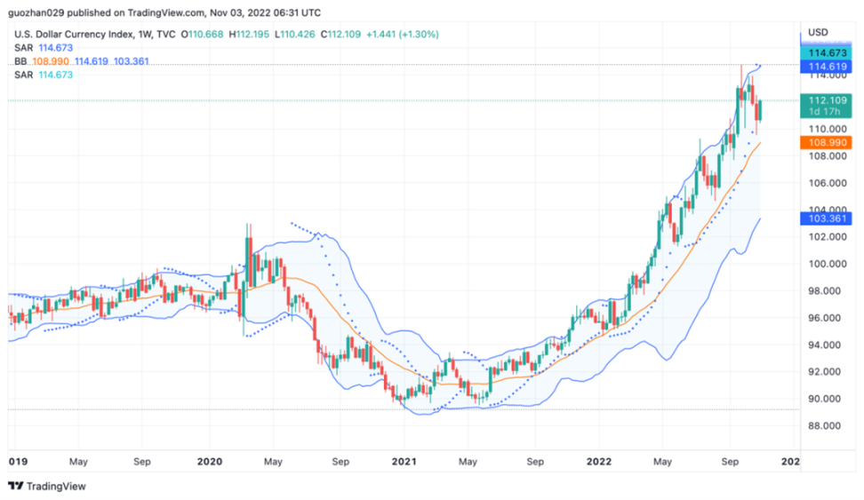 货币流动性趋紧。美国经济增长保持弹性,劳动力市场依然强劲背景下,美联储如期第四次加息 75 基点。鲍威尔发表鹰派言论,暗示会细水长流式加息,单次幅度可能放缓,但加息周期将比预测更长。令押注政策转向的市场情绪受挫,美股重回跌势,美元指数大涨。Crypto 市场回暖,暂时强于美股。