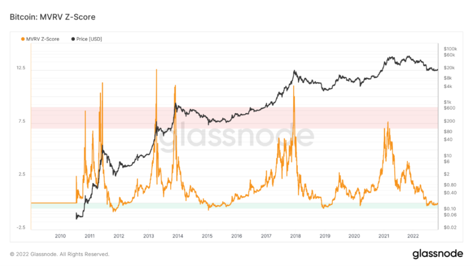 长期趋势指标 MVRV-ZScore 以市场总成本作为依据,反映市场总体盈利状态。当指标大于 6 时,是顶部区间;当指标小于 2 时,是底部区间。MVRV 跌破关键水平 1,暗示持有者总体上处于亏损状态。当前指标为 -0.07,处于绿色抄底区间。