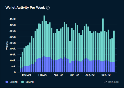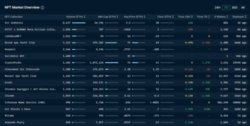 NFT 总市值依旧在持续走低,本周头部蓝筹项目中 Moonbirds 地板价下降 7.6%,而 Meebits 地板价单周上涨 17%;NFT 市场虽依旧交易冷淡,但对比前两周,本周在购买用户钱包处出现了明显增长,短期内买盘出现一定增长,后续若能持续将有利于 NFT 总体市值的增长。本周值得关注的项目是 Art Gobblers,短期内交易旺盛且地板价不断走高,本质上是与其发出的代币 GOO 呈正相关性,拥有 NFT 的用户持有的 token 越多,则产出的 token 越多,不断稀释掉单一持有 token 的价值,并将 NFT 价格推高。