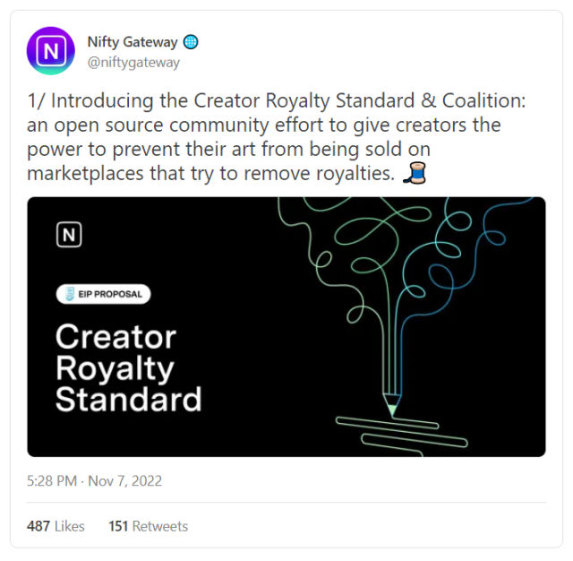 例如,Nifty Gateway 刚刚宣布它将永远尊重 NFT 版税,并公布了自己的创作者版税标准提案。展望未来,其他市场平台也会在这个问题上有类似的突破。