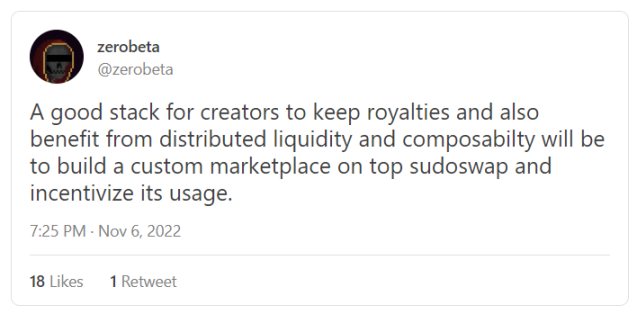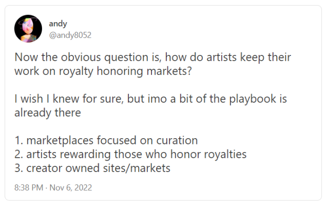 无论底层基础设施是基于 sudoswap、Reservoir、Zora 还是其他,这些创作者拥有的市场——可以由个人或艺术家 DAO 管理——可以提供激励措施,例如 NFT 空投,以巩固交易活动并更好地保证持续的版税支付。
