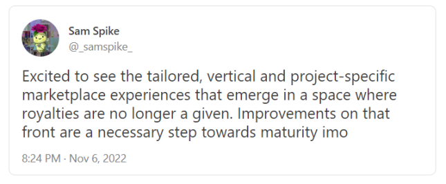 换句话说,未来每个艺术家和项目都可能有自己的定制市场,根据他们各自的 NFT 需求(包括版税需求)进行定制。