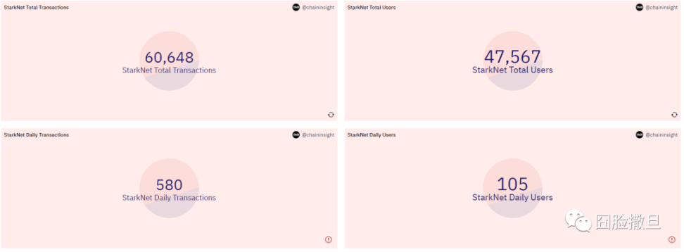 Dune 上数据显示,Starknet 主网地址数为 47000,总交易次数与浏览器数据不同,仅有 6 万次。