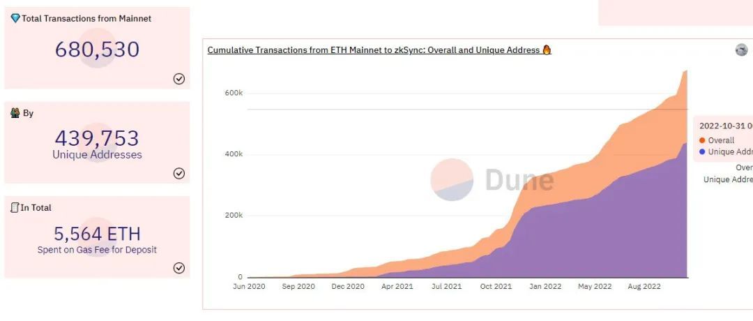 来自 Dune 的分析数据显示,Zksync 的链上地址数量为 67 万,不及以太坊等的零头,比 OP 和 ARB 也少 2/3;交易次数为 68 万次。