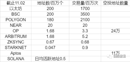 获得 OP 首轮空投的地址数量超过 24 万,获得 Aptos 空投的地址数量超过 11 万,这个数量对比 StarkNet 和 zksync 的链上地址数量,中奖率还是蛮高的。
