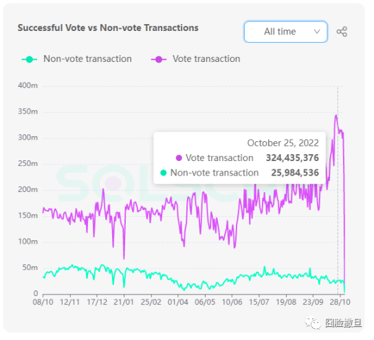 Solanascan 没有统计唯一地址数量,但活跃地址数量近一年的平均值约在 60 万左右,峰值是 2021 年 4、5 月之间的 350 万左右;Solana 网络的总交易次数超过了 1000 亿次,但这跟 Solana 网络的共识机制有关,包含了大量的网络共识投票交易,1000 亿次交易中,超过 7 成交易是共识投票。