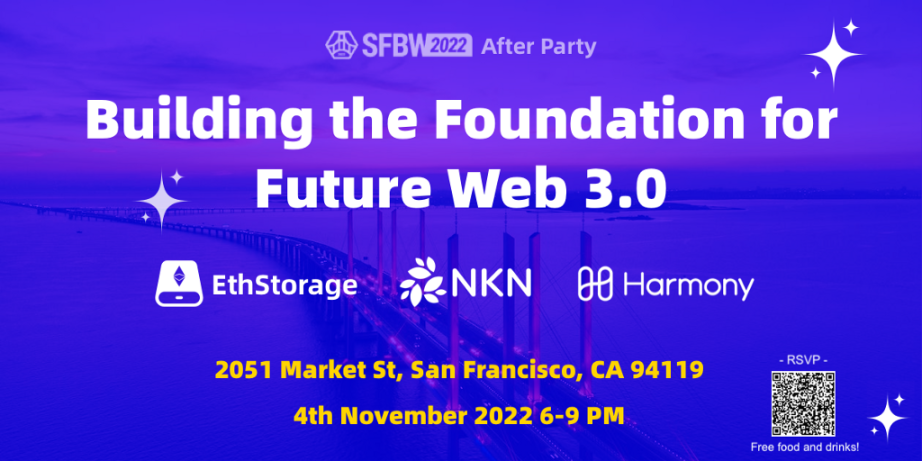 11 月 4 日,作为 2022 年旧金山区块链周(SFBW)的周边活动之一,EthStorage 联合 Harmony 和 NKN 举办了一场以“未来 Web3 基石”为主题的活动。