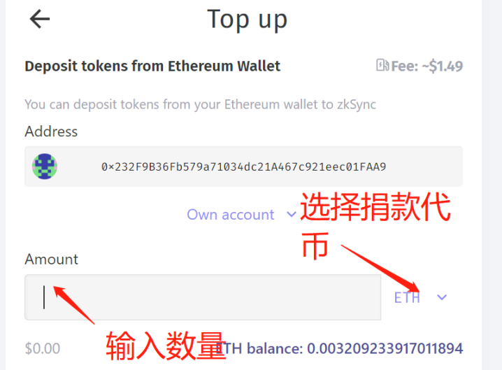 14)选择捐款代币及数量(这里注意下必须要选择点 ETH 作为 GAS)