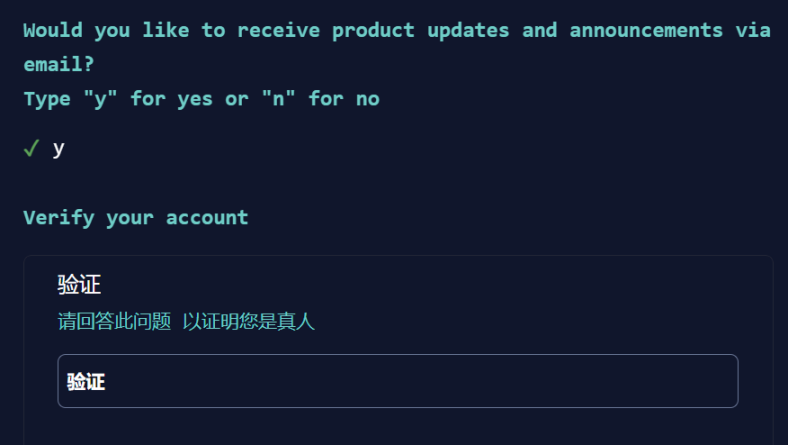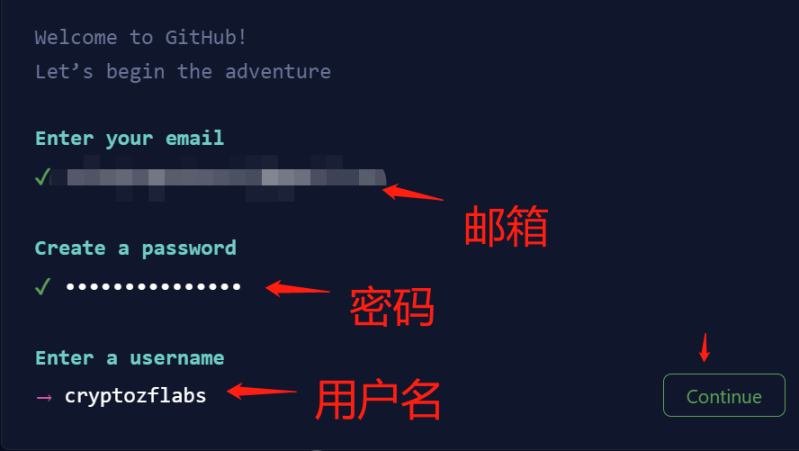 2)输入邮箱并点击继续,然后输入密码并点击继续,然后输入用户名并点击继续,然后会让你选择 y 或者 n 是否接收邮件通知。