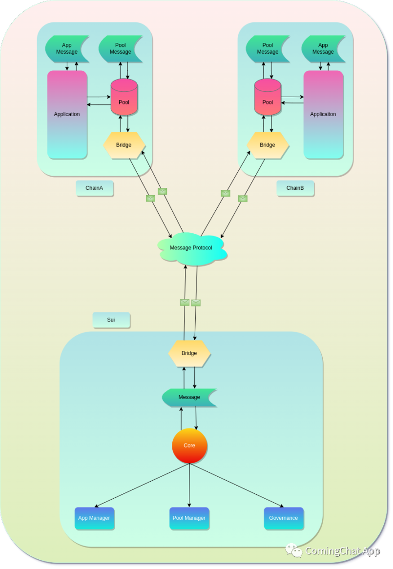 Sui 结算中心的应用管理器负责管理协议支持的应用。Omni Protocol 引入新应用,需要通过应用管理器获取权限并分配应用 ID。协议中的每一个应用拥有唯一 ID。用户可以通过应用 ID 自主选择想要使用的应用,为协议提供流动性,也可以根据协议推荐算法进行自动选择,让用户拥有较低的学习成本和良好的用户体验。应用管理器负责应用的冻结和下架,用于应对紧急情况。应用管理器负责制定或更新不同公链应用层接口使用的消息库。