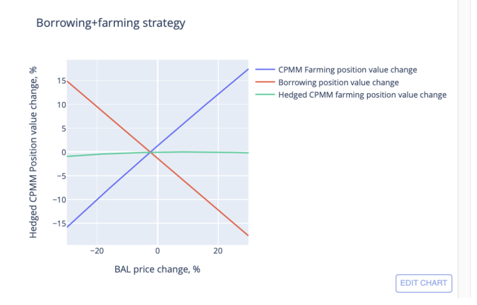 这种头寸的收益曲线看起来与之前的头寸相似,但收益是之前 2 或 3 倍 ( 取决于选择的杠杆 ),这意味着 farming 回报将成倍增加,但 IL 也将成倍增加。