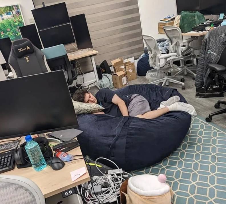 是 SBF 本人,他有时候早起,有时候晚起工作,视情况而定。我认出了这个人,因为在他的办公桌旁边有一张巨大的蓝绒豆袋椅,SBF 在长达数周的工作狂欢中,不离开办公室时,就把它作为一个小睡的地方,这一点很有名。