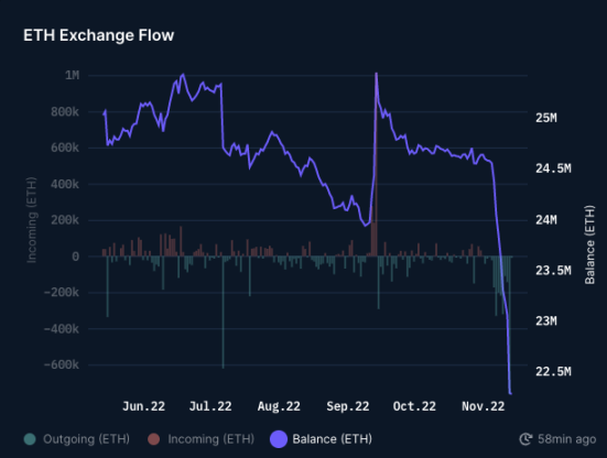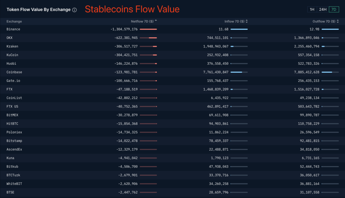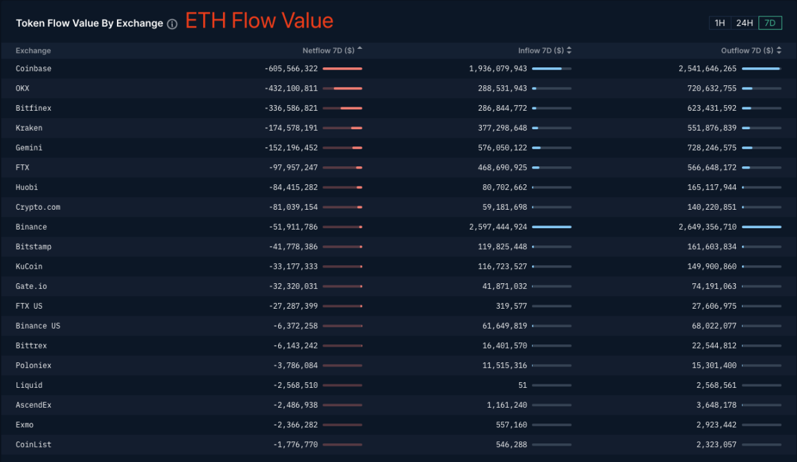 下图为过去 7 天内,交易所各类资产(包括稳定币、ETH)的流动情况,不难看出,亿级资金正从各个主流交易所向外流出。