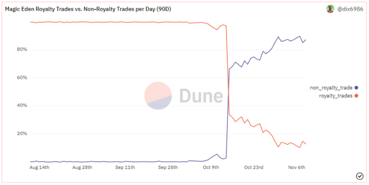 在其他市场采用可选版税的政策之后,NFT 交易市场竞争日益激烈,MagicEden 做出了艰难的决定,屈服于人们的议论。MagicEden 在宣布采用可选的版税政策时指出,越来越多的用户选择使用可选版税的市场来购买或出售他们的 NFT。