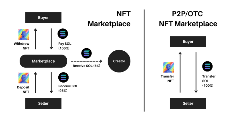 虽然 Solana 上的大多数 NFT 使用 Metaplex 的 NFT 标准,该标准有硬编码的版税,可以由遵循该标准的市场执行,但两个钱包之间简单的点对点交易就足以完全绕过创作者的版税,如下图所示。