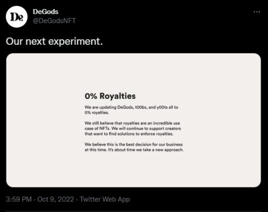 尽管如上所述,零 / 选择性的创作者版税确实带来了一些好处,但我们认为它造成的问题要比其他方面多得多。也就是说,我们确实同意,在这个领域需要有更大的创新,以确保独立艺术家和创作者得到应有的照顾。虽然 DeGodsNFT 最初并不支持零版税运动,但他们认识到这个问题需要用不同的方法来解决。
