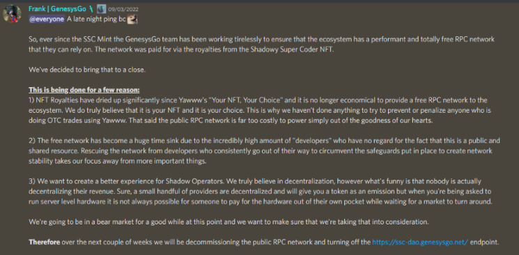 在最近几个月的全球市场熊市行情下,加上零版税的说法,许多 NFT 项目的现状不容乐观。由于缺乏资金,Shadowy Super Coders 不得不关闭他们的免费 RPC 节点,这些节点之前是由其二级 NFT 销售的版税支付的。