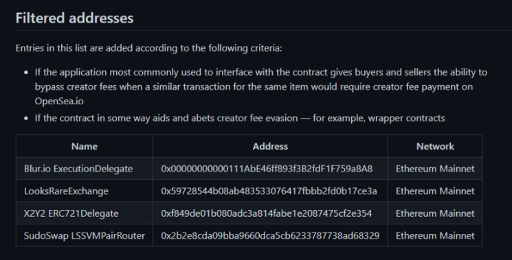 关于这一点,OpenSea 最近公布了其新工具的推出,用于链上执行新收藏的创作者版税。作为该工具的第一次迭代,OpenSea Operator Filter Registry 使创作者能够有效地将特定的包装合约列入黑名单,使其无法与其 NFT 交互。从本质上阻止 NFT 在其他不尊重创作者版税的竞争市场上交易。然而,由于其他平台被列入黑名单,NFT 交易者被迫继续支付 OpenSea 2.5% 的平台费用,这一披露遭到了社区的强烈反对。