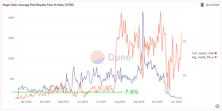 2022 年 8 月开始,单笔 NFT 交易支付的版税的日均百分比开始呈指数级增长,有些时候单笔交易的版税甚至高达 19.34%。这最终导致交易者寻求其他的 NFT 市场以避免支付如此高的费用,同时也在无意中引发了两极分化的辩论。