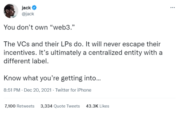 “你并没有拥有 Web3,拥有 Web3 的是 VC 和他们的 LP。”当 Jack Dorsey 说出这番话之后,激怒了很多人,但他说错了吗?