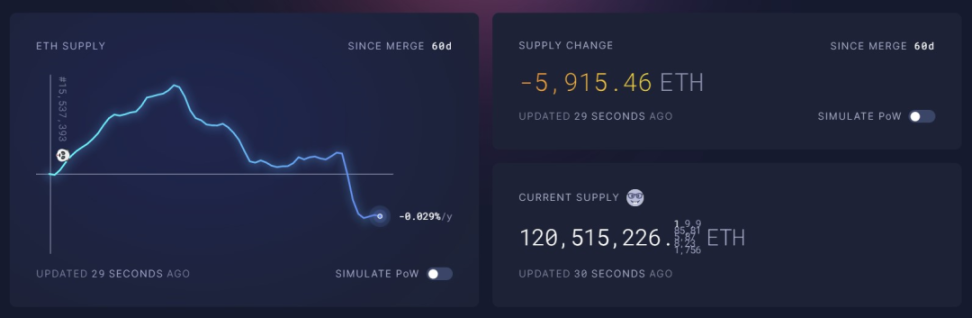 在以太坊 60 天之际,根据 ultra sound money 提供的数据显示,以太坊网络已经减少了 5915.46ETH 的发行量,已经处于通缩状态。可一起来看看此前期待的 EIP1559+POS 低通胀带来的「3 倍减半 / 通缩」到底起效了没有?