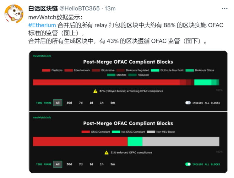 当前部署 ETH 信标链验证者节点的服务商、MEV 转包商等大部分为中心化的机构,非个人,因此它们要遵守当地法律合规审查是无可厚非的。当然就大部分区块接受审查并不会阻止以太坊网络上特定交易不被处理,只要不是 100% 阻止,交易仍然可能被其它区块打包提交,就是需要更长的时间等待。