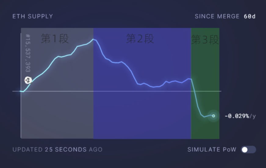 第一段是合并后的轻微通胀 9 月 15 日至 10 月 7 日期间,由于加密市场熊市,以太坊链上活动正处于低位,此时的链上活动主要是 SWAP 与 NFT、Layer2 相关的交易,GAS 价格普遍在 10-15 之间浮动。即便链上如此少,在 EIP1559 与 POS 低通胀率的加持下,22 天里,以太坊网络新增发行量 12400ETH,日均增发 563ETH。而合并前,日均增发在 1.5 万 ETH 左右,这何止是 3 倍减半。