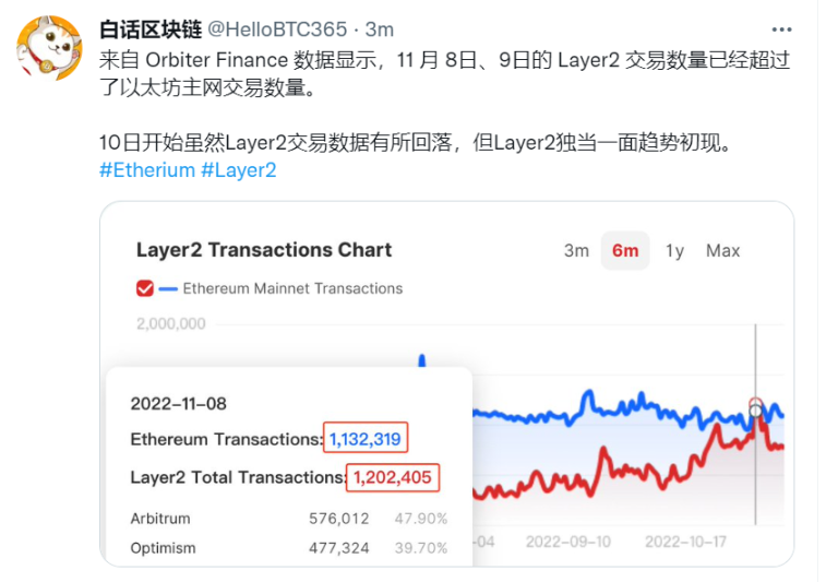 Layer2 方面,近日来自 Orbiter Finance 的 L2 data 数据显示,11 月 8 日 Layer2 交易数量超过了以太坊主网交易数量。意味着 Layer2 开始独当一面,未来,新公链或者还未消亡的「以太坊杀手们」将面临与继承以太坊安全性的同时拥有高性能的 Layer2 竞争的局面。