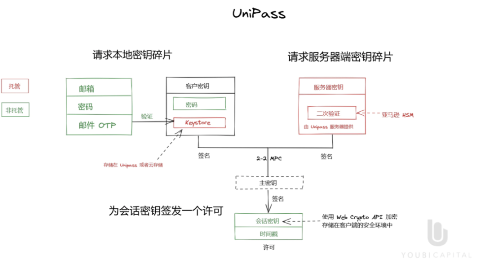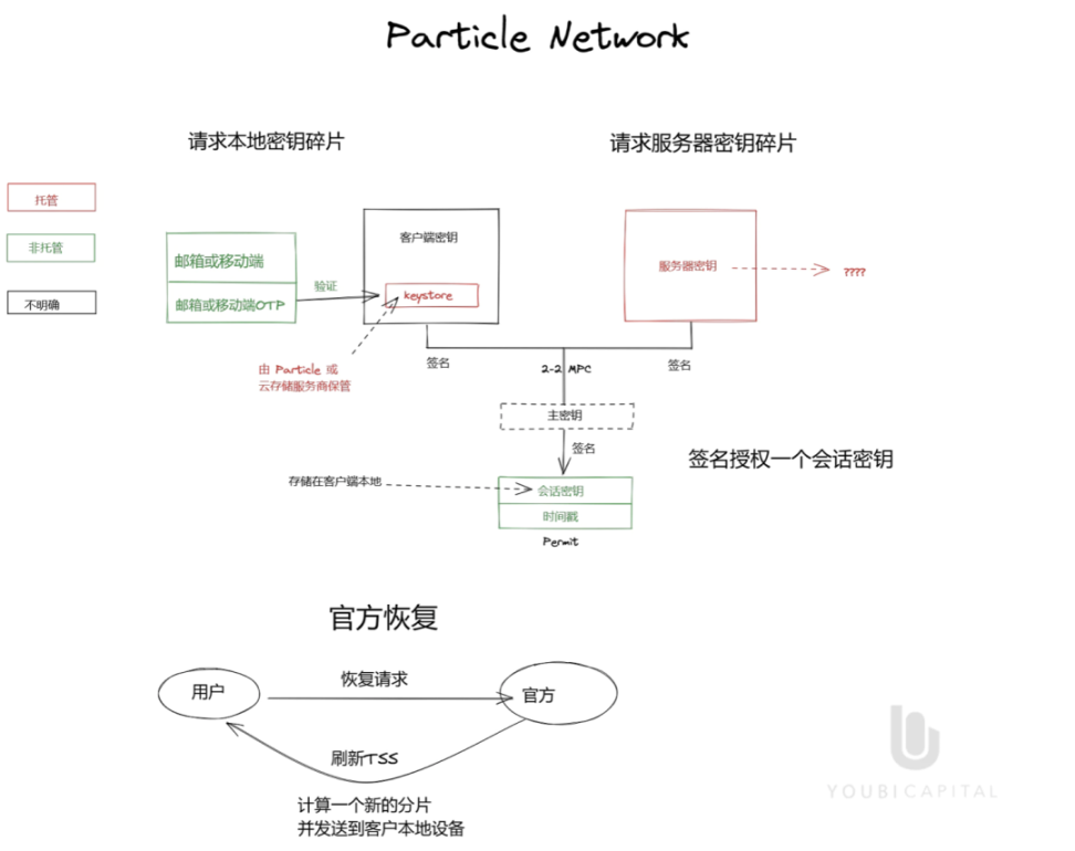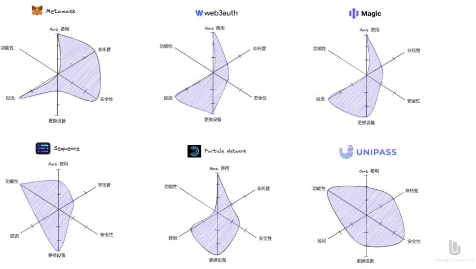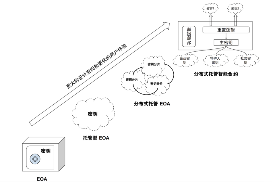 对于第一次接触 Web3 的 Web2 用户来说,初次上手的体验(客气地说)是不大愉悦的。传统的 EOA 钱包需要经过钱包生成,私钥管理,保存助记词等一系列复杂繁琐的流程。下一代无助记词钱包试图通过抽象私钥和助记词来解决这个摩擦点,只需点击几下就可以使用常用的 Web2 社交账号登录,实现一套更熟悉的登录流程。因此,无助记词钱包是 Web3 迈向大众普及的重要进步。钱包提供方实现无助记词钱包的一种方式是完全中心化的账户托管解决方案。然而,这与 Web3 应用的初衷背道而驰。正确的解决方案不应该以用户失去对账户的所有权和自托管为代价,来达到抽象化的便利性。而应该根据用户的需求在两者之间取得适当平衡。我们正处于将 Web2 消费者引入 Web3 的拐点。登录流程将在下一阶段的增长中至关重要。因此,创造一种既符合 Web3 去中心化的精神,又具备 Web2 的便利性和互操作性的登录和账户管理体验至关重要。正因为登录和账户管理体验如此重要,我们一直在密切关注 Web3 账户基础设施的创新。许多开发者也想了解 Web3 用户登录的最新进展和我们对钱包的看法。本文正是为此而来。最近所有钱包产品的迭代都可以通过它们对两个主要但相互牵制的特性的追求进行分析:无助记词密钥管理和自主保管。无助记词密钥管理是新用户无缝进入 Web3 的基础。这意味着用户不需要助记词短语或私钥就可以在新环境中登录账户。因此,他们的进入流程和账户管理是抽象的,类似于 Web2。从技术层面上来说,这种抽象是通过钱包提供方将客户账户的权限委派给服务器或第三方来实现的。例如,Magic Link 要求用户获得(官方)授权后才能访问加密密钥,并使用主密钥(由 AWS 上的中心化托管服务 HSM 保护)进行解密。其它方法则是通过将私钥拆分为多个片段并将它们存储在不同的位置来减少暴露整个密钥的风险,从而实现更大程度的去中心化。显而易见,用户需要在无私钥和自主保管两个特性之间作出取舍,这对许多加密货币使用者来说很重要(如果不是完全神圣不可侵犯的话),理由也很充分。当钱包服务依赖于第三方时,这些第三方就拥有审查交易,甚至接管资产的权力。它们可能会受制于政府监管和干预。对服务提供商依赖程度较高的钱包服务,在发生恶意攻击或事故时也更容易中断。那么,如何在无私钥和自托管这两者间权衡以获得最佳用户体验呢?对于 Web3 应用程序,我们可以假设其首要目标是无缝转化 Web2 用户,他们习惯于使用用户名 / 密码或社交登录,但不会立即拥有大量的链上资产。而接下来,随着用户资产的增长,他们往往对安全性和去中心化有更高的要求,此时开发人员应该考虑对两种特性的权衡进行调整升级。基于上述框架,我们对一些有代表性的无助记词钱包进行了调研,并根据它们的自主保管程度和其它相关因素对进行了分析。这些钱包是:MagicLink,Web3Auth,Particle Network,Sequence,UniPass。安全云存储、MPC 和智能合约等新技术丰富了新一代钱包的设计空间,为用户带来一系列管理和使用其 Web3 账户的新功能。以上针对 EOA 钱包 的改进方案对用户体验有不同程度的改善(如图 1 所示)。图 1:云计算、MPC 和智能合约在钱包设计中的应用诸如 Metamask、Imtoken 和 Phantom 等 EOA 钱包是最本地化与独立的钱包,当然不可避免也是使用体验最繁琐的类型。用户需要学习如何安全保存他们的助记词词或私钥,以及如何使用它们将账户导入到新设备中。账户地址来源于私钥,如果私钥丢失或被盗,账户地址将被永久锁定或无法访问。最直接的替代方案是使用托管服务。例如 Magic Link。托管人可以仅通过电子邮件或社交登陆授予账户访问权限。然而,托管服务的便利性往往伴随着密钥安全风险和中心化风险。更复杂的方法通常涉及 MPC(SSS、TSS),如 Web3Auth 和 Particle Network。通过将密钥拆分为几个部分,登录时必须由多个密钥持有者进行身份验证,从而分散了管理权,降低了集中化的风险。除此之外,也有成功者将智能合约结合在 MPC 之上,引入了账户管理逻辑,允许用户重构或重置由 MPC 管理的主密钥,进一步降低了中心化风险。账户管理逻辑的核心就是选择所谓的守护人,以实现深度自定义,消除对钱包服务提供商或特定守护人的依赖。除了处理无助记词密钥管理和自主保管之间的取舍之外,这些无助记词钱包还可以从用户体验的六个维度进行评估。Gas 费用:创建智能合约账户在链上产生的 Gas 费用(常规使用的 Gas 费用接近 EOA 钱包)延迟:创建和导入过程花费的时间(例如,由于是链上的过程,智能合约钱包通常需要更长的时间)安全性:单点故障的存在,包括任何单独的一方,如服务提供商或集成前端,是否有能力暴露、重构或重置完整的密钥或凭据,以完全控制账户托管:服务可用性和抗审查能力(即服务对服务提供者的依赖性以及托管者是否能够访问或冻结客户的账户)功能性:能够实现额外的账户管理逻辑(例如,资助 Gas 费用、多签名、委托签名)在这些补充因素中,比起 Gas 费用、延迟和附加功能这些显著影响用户体验的因素,安全性和托管因素对用户来说相对是无感的。然而,安全漏洞或服务中断等偶然事件可能对企业或个人造成灾难性的影响。Magic Link 是一个支持电子邮件和社交登录的无助记词钱包。在得到 Magic Link 的授权后,客户在新设备登陆账户时,从托管人处下载一份他