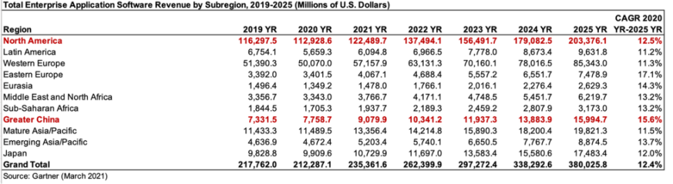 先来看一组数字对比:美国人均消费支出是中国的 13 倍左右,而北美的软件总支出也恰好是大中华区的 13 倍左右。