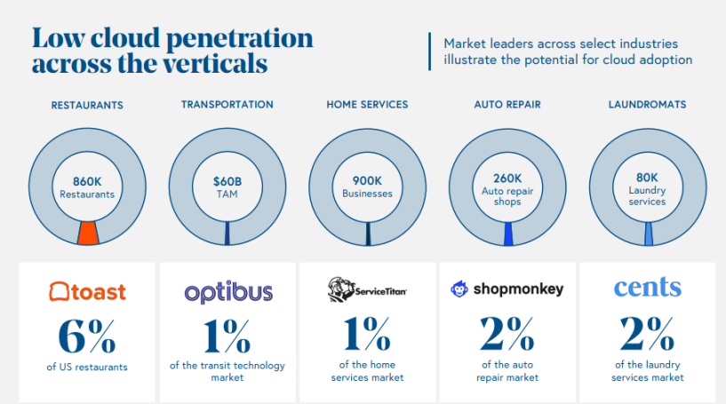虽然美国整体 SaaS 的成熟度很高,但具体到一些领域,尤其是非科技行业,SaaS 的渗透率还很低,例如餐饮 SaaS Toast 在 2021 年在全美餐厅的渗透率只有 6%,这使得 Vertical SaaS 投资也成为了一个专门的主题和趋势。