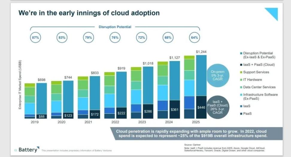 在拾象团队和硅谷头部 VC 的交流中,Cloud 还能继续投 10 年是一个普遍共识,到今天,Cloud 的渗透率也就 20% 左右。