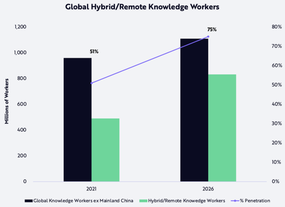 根据 Gartner 数据,2021 年底,全球有 4.89 亿知识工作者(除中国大陆外)采用混合办公或完全远程办公的工作模式,ARK 预测,这一数据将于 2026 年达到 8.32 亿,也就是说还有大约 70% 的增长空间。