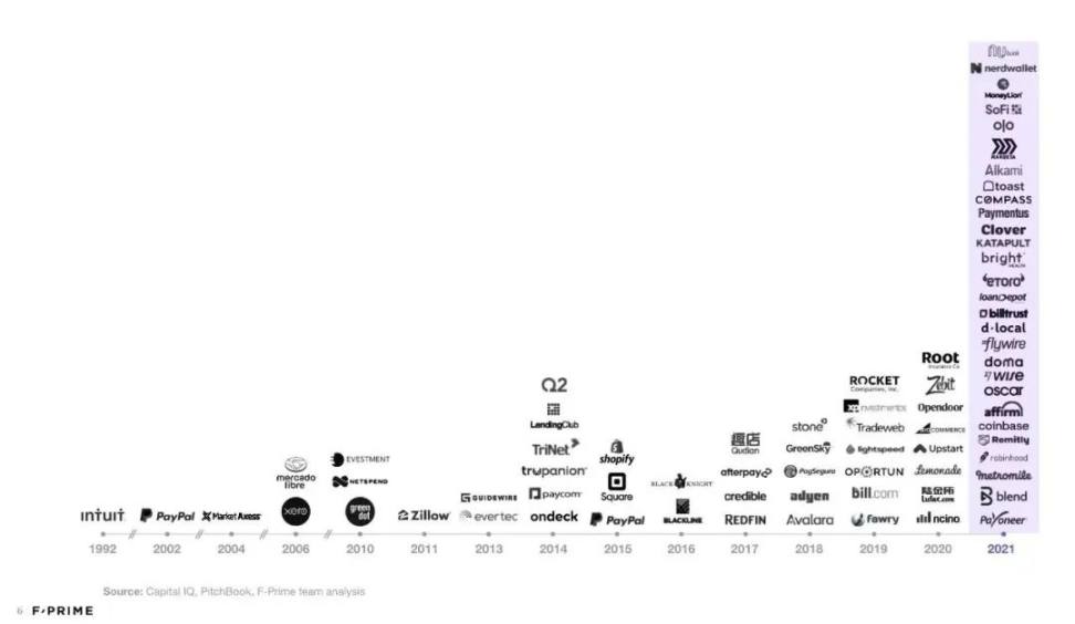 首先是退出被验证。如果在近期看二级市场的 Fintech 公司的话会感觉“股价跌了不少”是这些公司的一个共性,这是因为其中有将近 50% 是在 2021 年的高点上市,所以在今年宏观环境发生变化之后,整个 Fintech Index 下跌是预期之中的事情。但 2021 年更重要的意义在于,29 家主流 Fintech 公司上市是对 Fintech 板块退出的验证,包括 Nubank、dLocal、Coinbase、Robinhood、Wise、Robinhood 这些品类开创者。