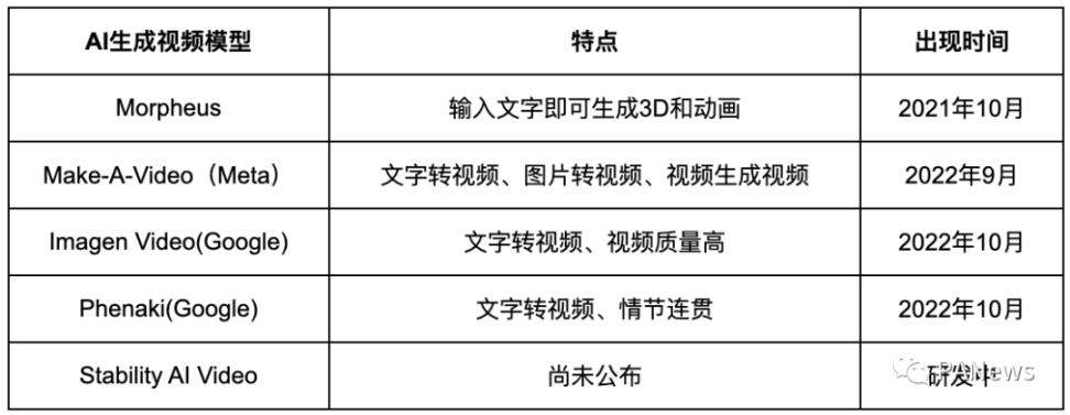 在 AI 生成视频方面,目前 AI 生成视频的算法模型还未成熟,也还没出现一家独大的局面。9 月底 Meta 公布了 AI 制作视频工具 Make-A-Video,Google 也紧接着发布了 Imagen Video 和 Phenaki。Make-A-Video 具有文字转视频、图片转视频、视频生成视频三种功能。仅仅通过文本描述,Phenaki 就可以生成一段情节连贯的视频。10 月 9 日 B 站上的 UP 主“秋之雪华”公布了全球首个 AI 绘图、AI 配音的动画《夏末弥梦》的 DEMO,其画面精美程度不输专业画师的作品。